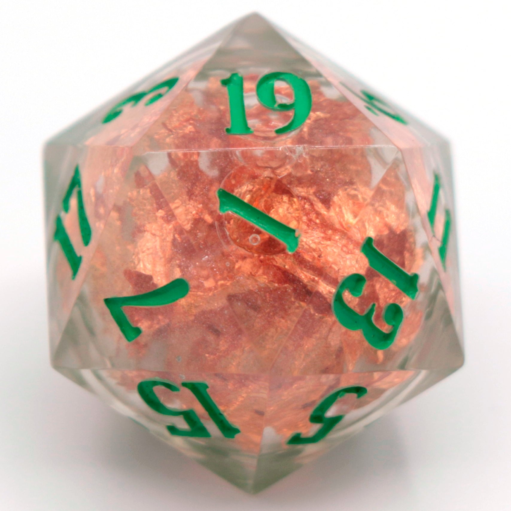 Part of a series of dice inspired by the Allomancy magic system in Brandon Sanderson's Mistborn series. This design is specifically inspired by copper, and the so-called Smokers who utilize it.