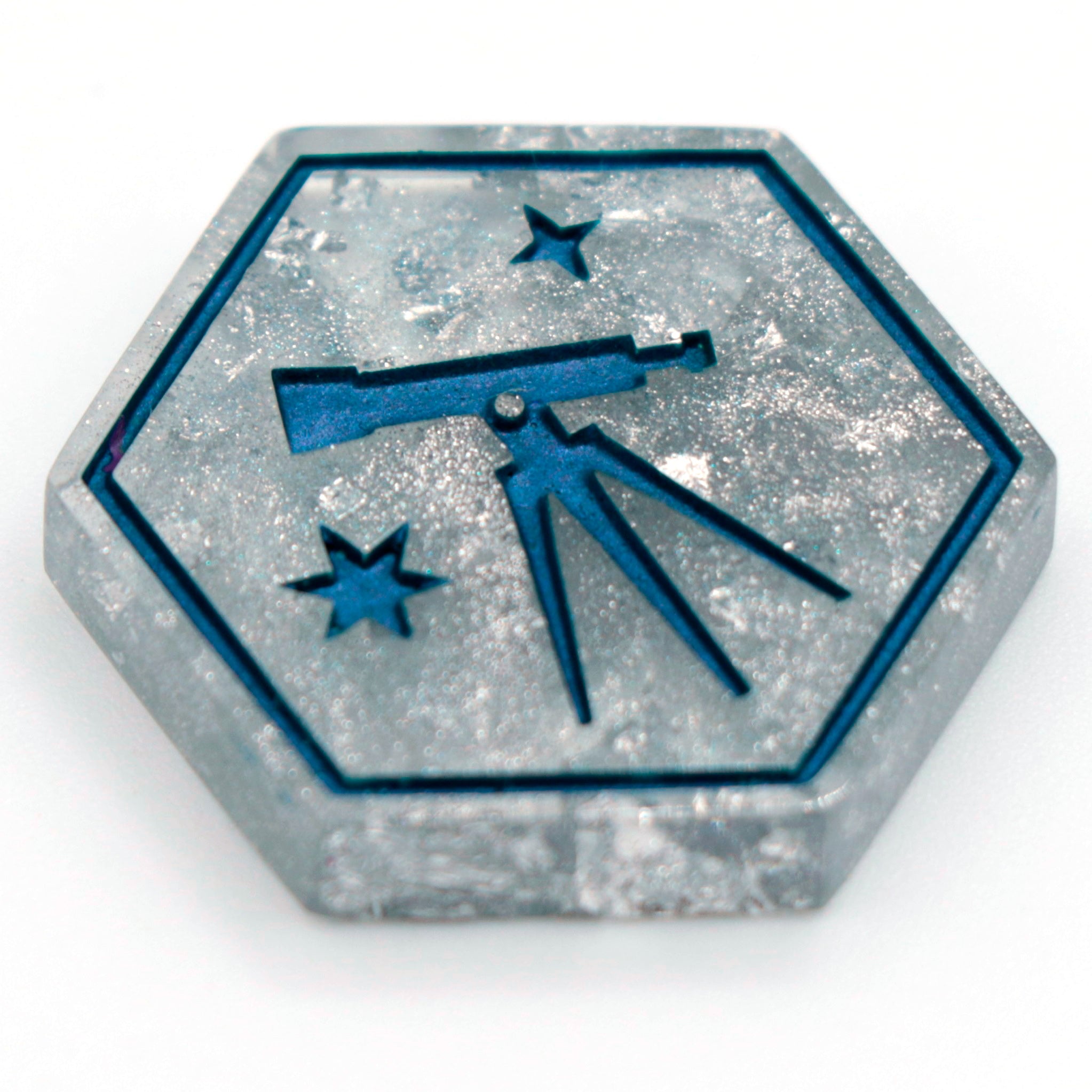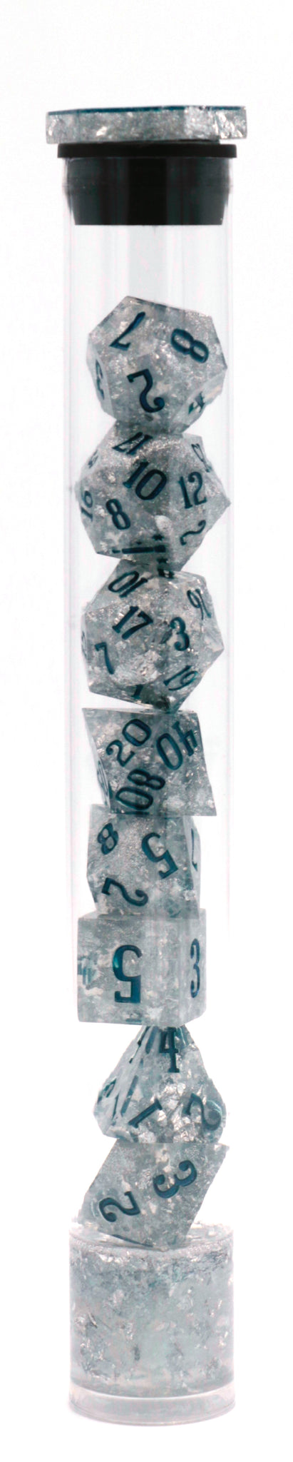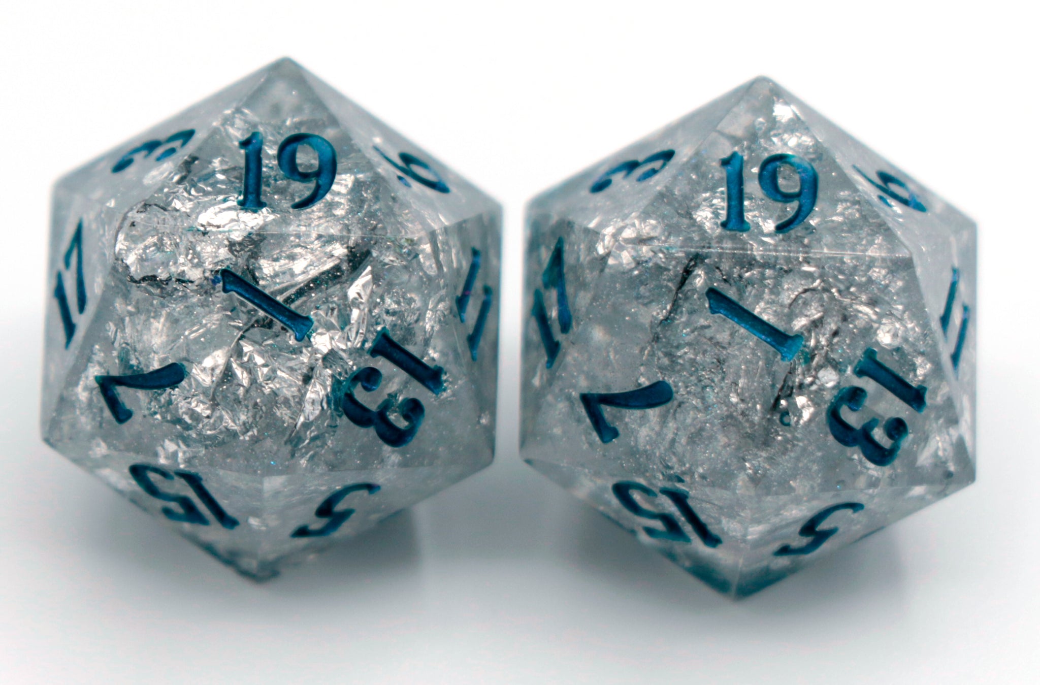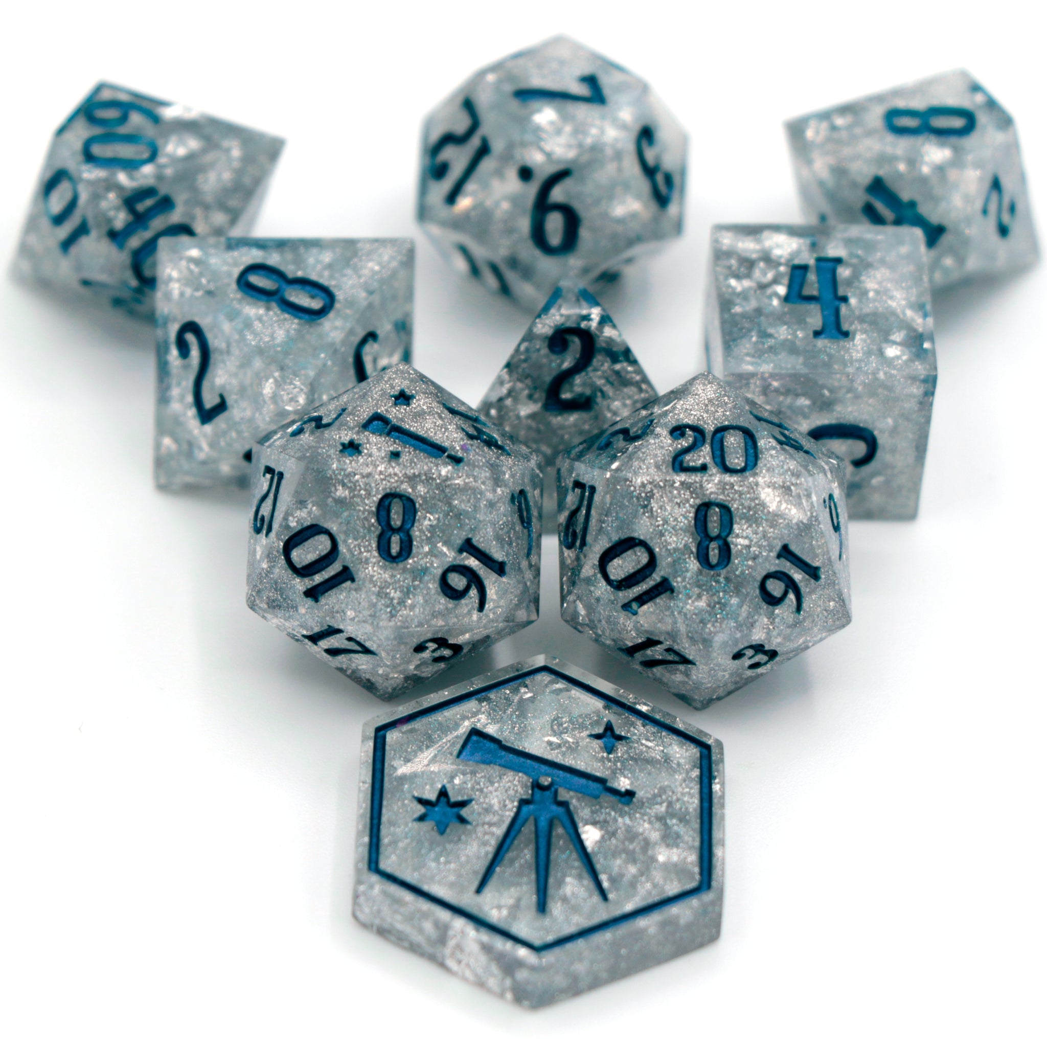 Part of a series of dice inspired by the Allomancy magic system in Brandon Sanderson's Mistborn series. This design is specifically inspired by tin, and the so-called Tineyes who utilize it.